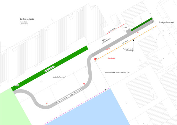 Le 1er février 2012, après la présentation publique de l’énorme travail effectué par les habitants qui se sont impliqués dans les différents groupes de travail – notamment pour dessiner différentes propositions pour l’aménagement du terrain –, M. Seignolles a projeté, à la stupéfaction générale, le plan des travaux prévus par ses services : une grand allée droite traversant de part en part le jardin et, fort curieusement, n’aboutissant nulle part puisqu’un seul accés avait été prévu (allée Tissot).