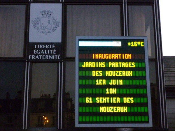 Pour inscrire formellement dans l’histoire le jardin partagé des Nouzeaux, madame le maire procèdera samedi 1er juin à 10 heures, à son inauguration au 61, sentier des Nouzeaux. A bientôt aux amateurs de jardins et de jardinage !